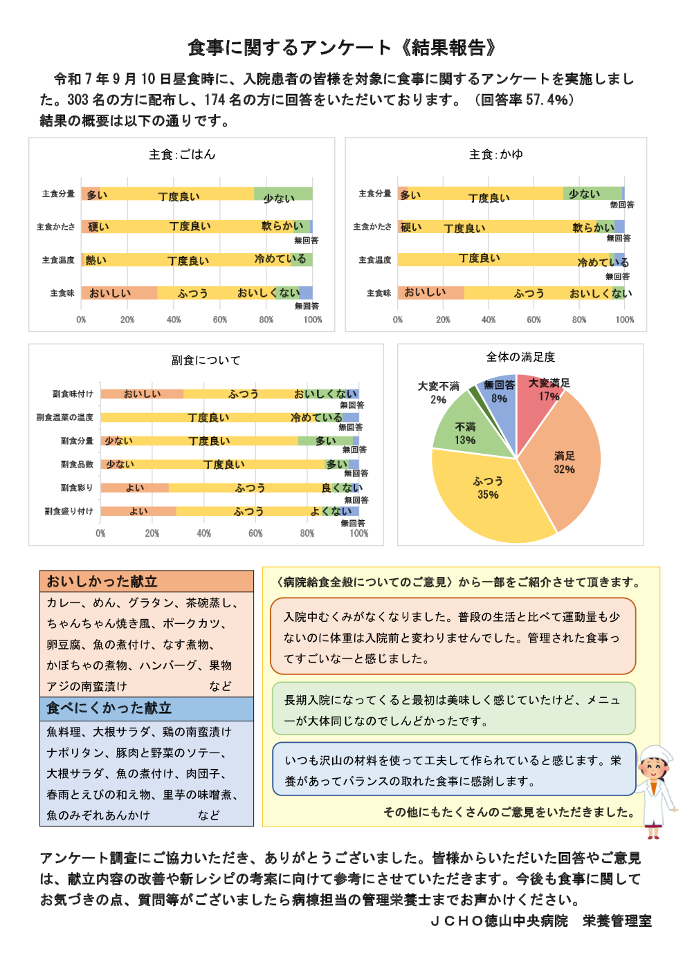 食事に対する意見を把握し内容の改善を行うため、食事を提供している入院患者様に年に2回アンケートにご協力いただいております。